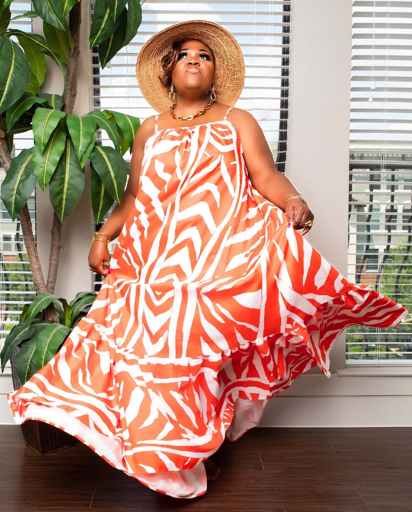 PRINTED VOLUMINOUS MAXI DRESS.Model wearing ONE SIZE FITS ALL UP TO 3x