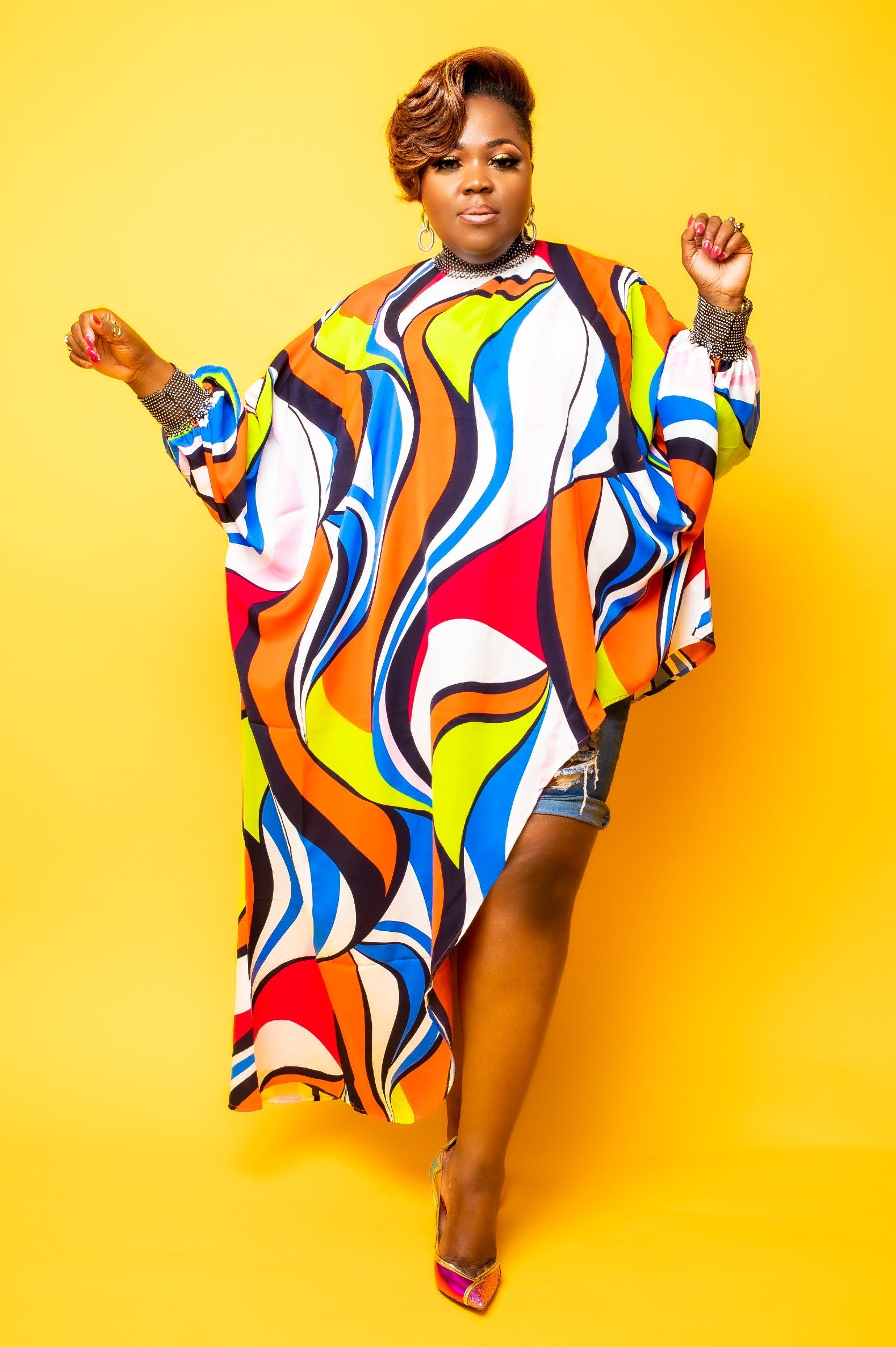 Elegant Hi-Lotop in a multi GREEN/ or ORANGE chiffon material with rhinestones trimmed sleeves and collar. MODEL IS WEARING ONE SIZE FITS ALL UP TO 3X. Model paired it with a distressed denim short.